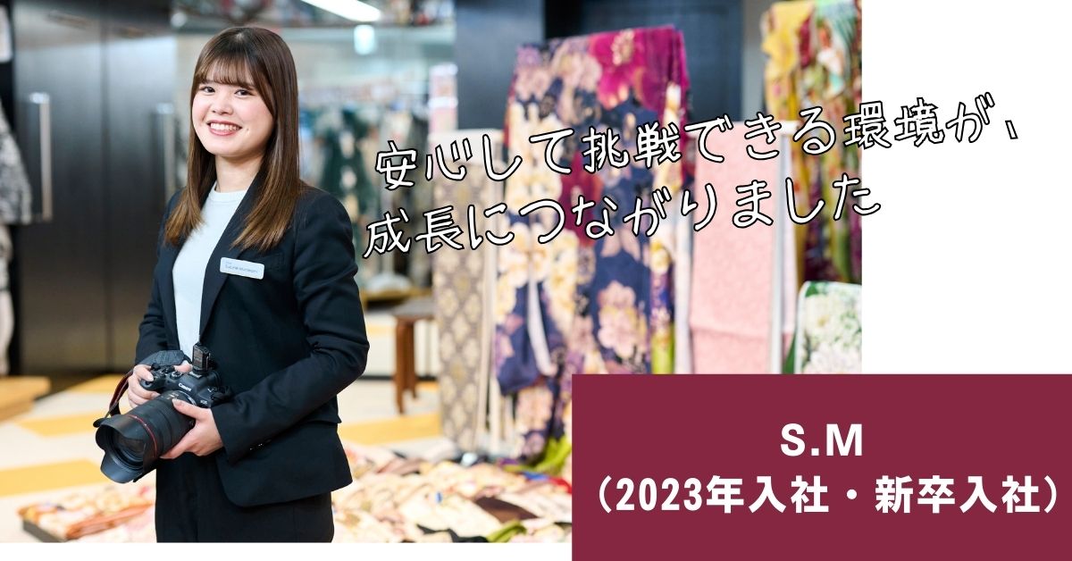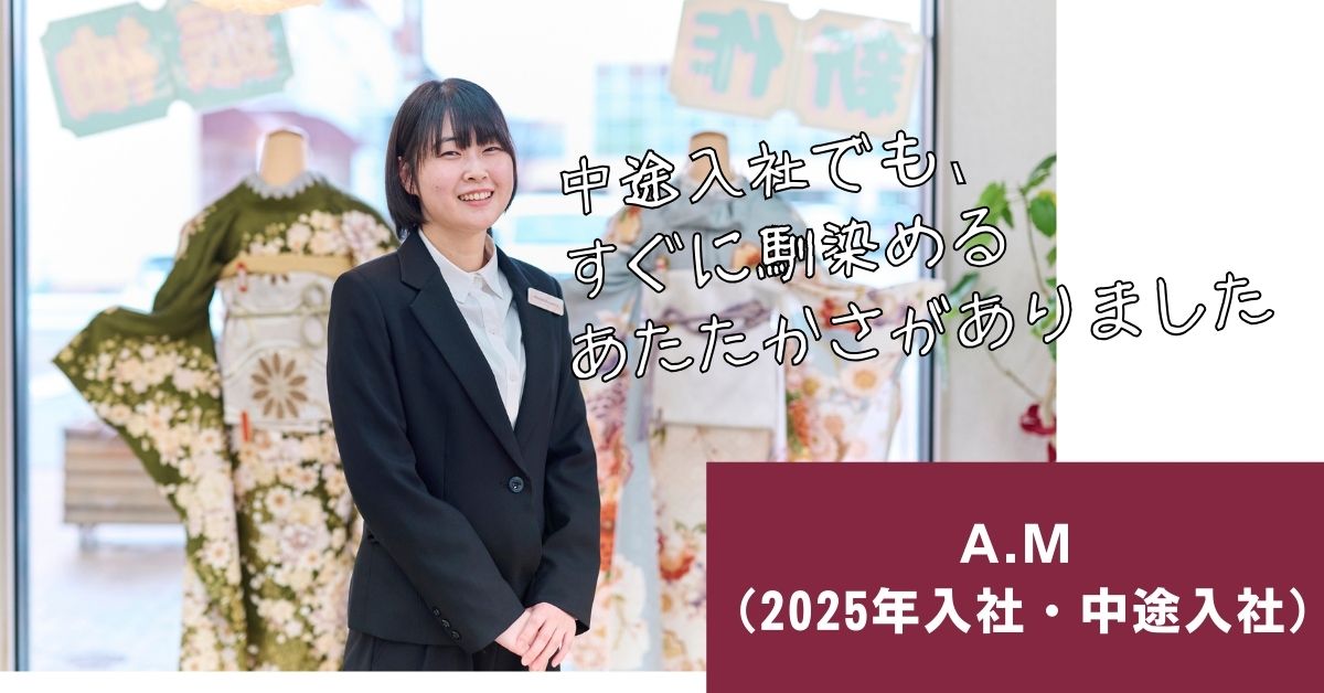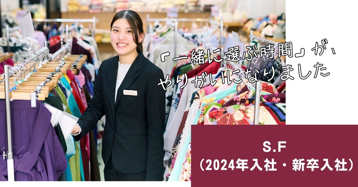 もともとはウェディング業界を目指していましたが、アルバイトを通して現場の忙しさや働き方を知り、「長く続けられる仕事」を考えるようになりました。そんな中、授業で着物に触れたことをきっかけに、和装の世界に魅力を感じ、着物を専門に扱う会社を探し始めました。